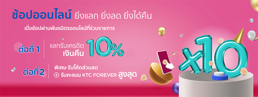 สิทธิพิเศษสำหรับลูกค้าบัตรเครดิต KTC แลกรับเครดิตเงินคืน 10% + คะแนน KTC FOREVER สูงสุด X10 เพียงช้อปออนไลน์ผ่านพันธมิตรออนไลน์ที่ร่วมรายการด้วยบัตรเครดิต KTC