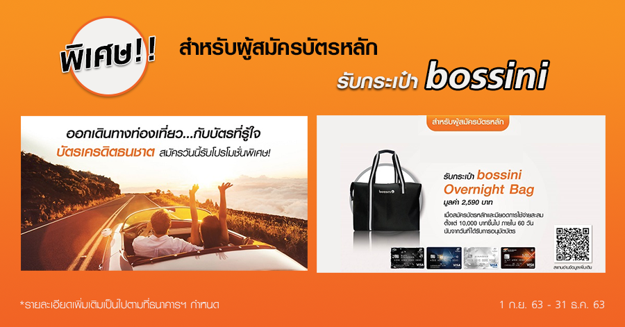 ต่อที่ 1 : รับกระเป๋า Bossini overnight bag มูลค่า 2,590 บาท เมื่อมียอดการใช้จ่ายสะสมตั้งแต่ 10,000 บาทขึ้นไป ภายในระยะเวลา 60 วัน นับจากวันที่ได้รับการอนุมัติ โดยธนาคารจะจัดส่งของกำนัลให้ภายใน 90 วัน นับจากวันใช้จ่ายครบตามหลักเกณฑ์ดังกล่าว