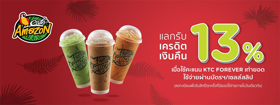 สิทธิพิเศษสำหรับลูกค้า บัตรเครดิต KTC แลกรับเครดิตเงินคืน 13% เมื่อใช้คะแนน KTC FOREVER เท่ายอดใช้จ่ายผ่านบัตรฯ/เซลส์สลิป ที่ร้าน คาเฟ่ อเมซอน (ลงทะเบียนเพื่อรับสิทธิ์ทุกครั้ง) ผ่านทาง SMS / Website