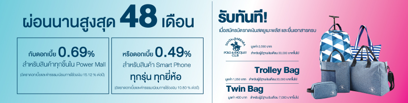 ไม่ว่าคุณจะจำเป็นใช้ หรือรออะไร เราพร้อมให้คุณตลอดๆ ผ่อนสินค้าทุกประเภท ทุกชิ้น ดอกเบี้ยพิเศษ ตามที่คุณสะดวก 0% นานสุด 20 เดือน สำหรับสินค้าหลากหลาย 0.49% ต่อเดือน นาน 6-48 เดือน ผ่อนสบายๆ ยาวๆ ไป สำหรับมือถือทุกรุ่น รุ่นใหม่ที่คุณรอด้วยนะคะ 0.69% ต่อเดือน นาน 6-48 เดือน โปรนี้หยิบเลย 3,000 ทุกชิ้น ผ่อนได้หมด ทุกโปร ผ่อนขั้นต่ำ 400 บาทต่อเดือน Power Mall ที่ The Mall ทุกสาขา วันนี้ - 31 ธ.ค. 63 สมัครบัตรใหม่ ยื่นเอกสารครบ รับทันทีของสมนาคุณ 1 ชิ้น เมื่อได้รับอนุมัติ ผ่อนสินค้าใช้โปรได้ทันที หรืออยากกดเงินสดก็ได้เลย 0% 30 วัน คุ้มสุดในบัตรเดียว (อัตราดอกเบี้ย และค่าธรรมเนียมการใช้วงเงิน 10.80% หรือ 15.12% ต่อปีสำหรับผ่อนสินค้า และ 19.8% หรือไม่เกิน 25% ต่อปีสำหรับกดเงินสด อนุมัติวงเงินไม่เกิน 5 เท่าของรายได้ตามเงื่อนไขของบริษัท)