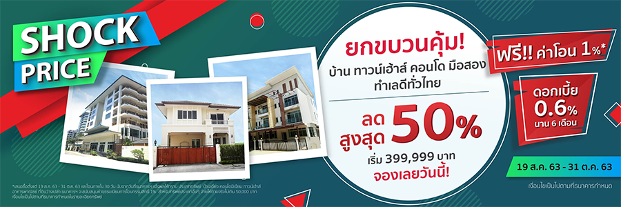 SHOCK PRICE!! ลดสูงสุด 50% ฟรี!! ค่าโอน 1% บ้านเดี่ยว ทาวน์เฮ้าส์ คอนโด มือสอง ทำเลดี ทั่วไทย