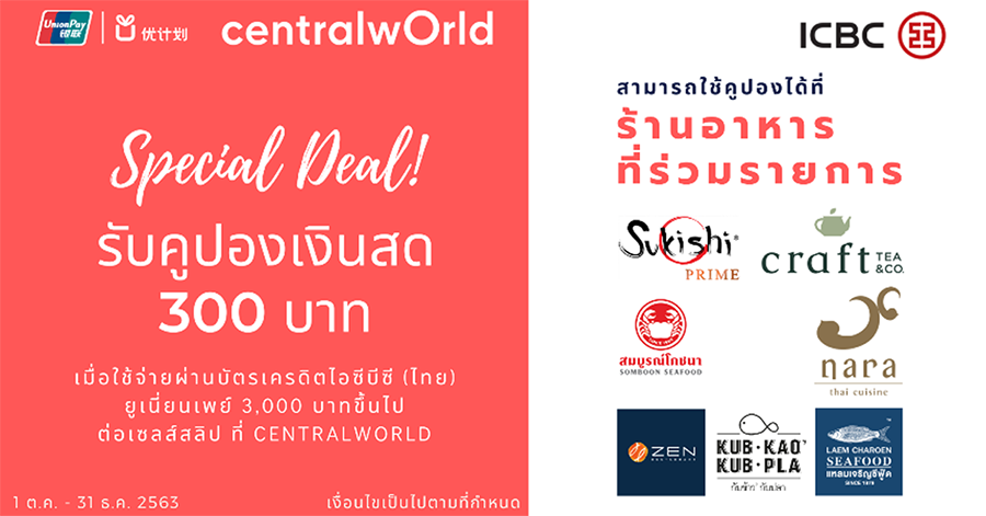 ข้อกำหนดและเงื่อนไข - รับคูปองเงินสด 300 บาท เมื่อใช้จ่ายผ่านบัตรเครดิตไอซีบีซี (ไทย) ยูเนี่ยนเพย์ 3,000 บาทขึ้นไป ณ ร้านค้าที่รับบัตรยูเนี่ยนเพย์ในเซ็นทรัลเวิลด์