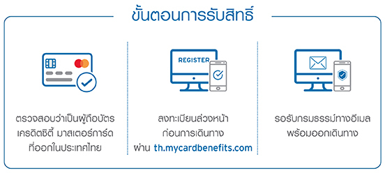 - ผู้ถือบัตรจะต้องลงทะเบียนเพื่อรับสิทธิ์การประกันภัยการเดินทางผ่านทางเว็บไซต์ th.mycardbenefits.com ก่อนการเดินทางอย่างน้อย 1 วัน และเมื่อลงทะเบียนสำเร็จผู้ถือบัตรจะได้รับการยืนยันความคุ้มครอง (Confirmation of Coverage) ผ่านช่องทางอีเมลซึ่งสามารถนำไปใช้เพื่อการสมัครวีซ่าเชงเกน (Schengen Visa) และใช้เพื่อเข้าถึงรายละเอียดของกรมธรรม์การประกันภัยการเดินทางได้