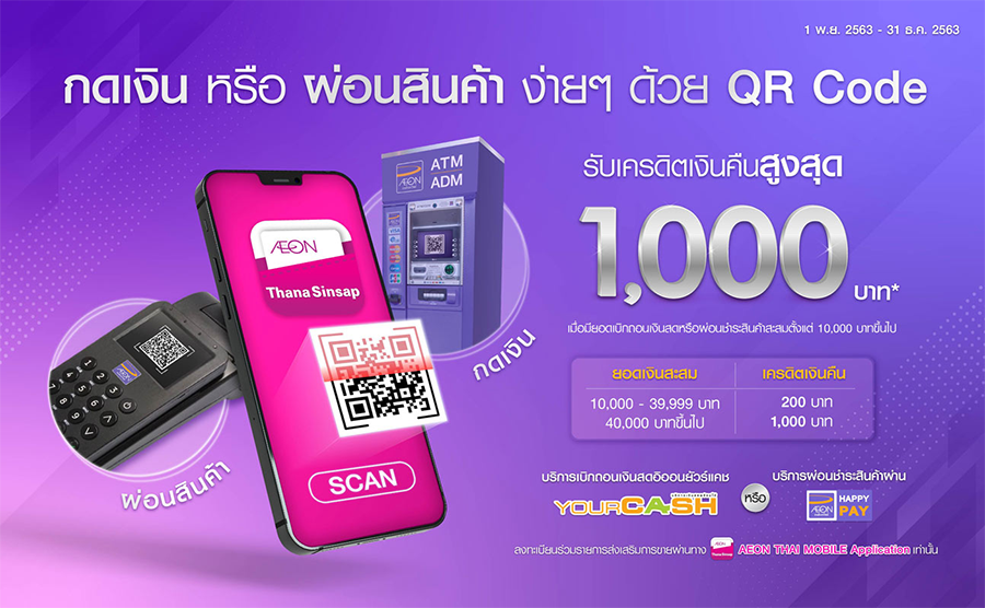 หมายเหตุ: วงเงินเบิกถอนเงินสดเป็นไปตามวงเงินที่ได้รับอนุมัติจากบริษัทฯ ยอดที่ผู้ถือบัตรสามารถเบิกถอนเงินสดได้ ขึ้นอยู่กับวงเงินคงเหลือในบัญชี โดยวงเงินสำหรับเบิกถอนเงินสดอาจมีการเปลี่ยนแปลงขึ้นอยู่กับประวัติการชำระเงิน) - บริษัทฯ สงวนสิทธิ์การให้เครดิตเงืนคืน เฉพาะลูกค้าที่ทำรายการ เบิกถอนเงินสด และ/หรือผ่อนชำระสินค้า โดยไม่ใช้บัตร (ผ่านการสแกน QR CODE) เท่านั้น ลูกค้าที่ทำรายการโดยใช้บัตร ไม่สามารถรวมยอดกับการใช้บริการเบิกถอนเงินสด และ/หรือผ่อนชำระสินค้า (AEON Happy Pay) ผ่านรายการส่งเสริมการขายนี้ได้