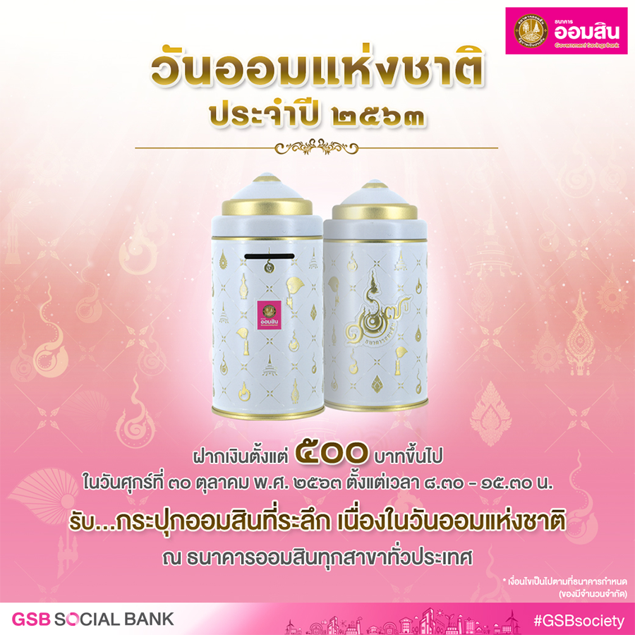 ธนาคารออมสินจัดงานวันออมแห่งชาติ วันศุกร์ที่ 30 ตุลาคม 2563 ออกแคมเปญเงินฝากเน้นออมต่อเนื่องสำหรับเด็ก รับสิทธิพิเศษ 3 ต่อ ทั้งดอกเบี้ย เงินขวัญถุง และลุ้นรับรางวัลมูลค่า 10,000 บาท เมื่อเปิดบัญชีเงินฝาก Youth Savings ตั้งแต่ 100 บาท และฝากต่อเนื่องตั้งแต่ 50 บาททุกเดือน จนถึง 31 สิงหาคม 2564 ด้านของที่ระลึก จัดทำ "กระปุกออมสิน 107 ปี ธนาคารออมสิน" มอบผู้ฝากเงินด้วยตัวเอง 500 บาทขึ้นไป ที่ธนาคารออมสินทุกแห่งทั่วประเทศ