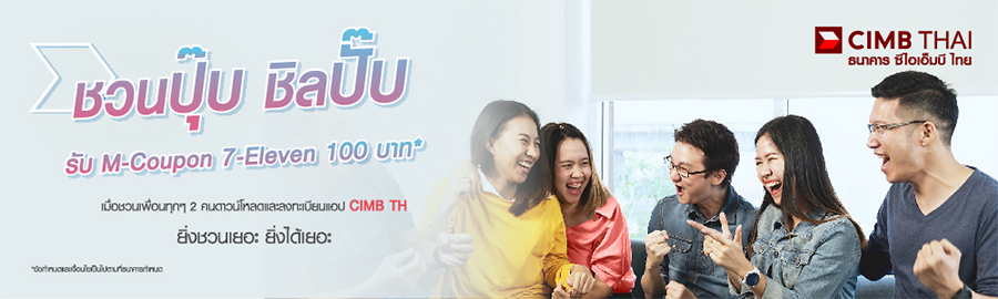 ชวนปุ๊บ ชิลปั๊บ รับ M-Coupon 7-Eleven มูลค่า 100 บาท เมื่อชวนเพื่อนทุกๆ 2 คน ดาวน์โหลดและลงทะเบียนเข้าใช้แอป CIMB Thai Digital Banking