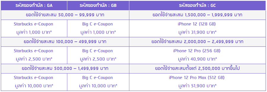 - บริษัทฯ จะคำนวณสิทธิ์ในการรับของกำนัลจากยอดใช้จ่ายสะสมผ่านบัตรเครดิตโดยยอดค่าใช้จ่ายที่เกิดจากบัตรเสริมจะถูกคำนวนเข้าบัตรหลัก และสมาชิกผู้ถือบัตรหลักเท่านั้นที่มีสิทธิ์รับของสมนาคุณ ทั้งนี้ไม่นับรวมถึงการชำระค่าสินค้าหรือบริการประเภทสินค้าผ่อนชำระ, สินเชื่อเงินกู้และเช่าซื้อ, การชำระค่าสินค้า/บริการทุกรายการในหมวดประกันภัย/ชีวิต เช่น กรมธรรม์ประกัน การชำระค่าเบี้ยประกันภัย ผ่านตัวแทนรับชำระออนไลน์ (MCC Code 5960, 6300, 9223), การซื้อหน่วยลงทุน/กองทุนรวมทุกรายการ (MCC Code 6211), การแลกเปลี่ยนเงินตราต่างประเทศ (MCC Code 6051, 4829), การเบิกรายการที่มีการยกเลิกหรือคืนสินค้า/บริการ ถอนเงินสดล่วงหน้า, ดอกเบี้ย ค่าธรรมเนียมการใช้วงเงิน ค่าปรับ ค่าธรรมเนียมและภาษีอากรต่างๆ และรายการที่มีการยกเลิกหรือคืนสินค้า/บริการ