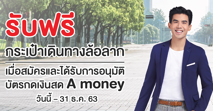 สิทธิพิเศษสำหรับผู้ที่ได้รับอนุมัติ บัตรกดเงินสด A money ที่มีฐานเงินเดือนตั้งแต่ 18,000 บาทขึ้นไป เพียงทำรายการเบิกถอนเงินสดในวันแรกตั้งแต่ 10,000 บาทขึ้นไป และมียอดเงินต้นคงค้าง ตามเงื่อนไขระยะเวลาที่กำหนด จะได้รับกระเป๋าเดินทางล้อลาก ขนาด 18 นิ้ว มูลค่า 1,980 บาท