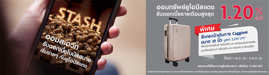 บัญชีเงินฝากออมทรัพย์ยูโอบีสแตช (UOB STASH) ทางเลือกใหม่สำหรับการออมเงินกับบัญชีออมทรัพย์แบบไม่มีสมุดคู่ฝาก พิเศษ! ออมวันนี้...รับกระเป๋าเดินทาง Caggioni ขนาด 20 นิ้ว มูลค่า 5,550 บาท* เมื่อเปิดบัญชีขั้นต่ำ 600,000 บาท และมียอดเงินฝากเฉลี่ยของเดือนไม่น้อยกว่า 600,000 บาท ติดต่อกัน 4 เดือนปฏิทิน