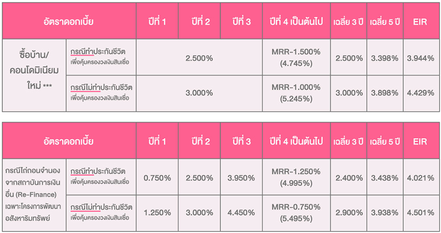 - อัตราดอกเบี้ยที่แท้จริงตลอดอายุสัญญา (EIR) คำนวณจากวงเงินกู้ 1,000,000 บาท ระยะเวลาผ่อนชำระ 20 ปี