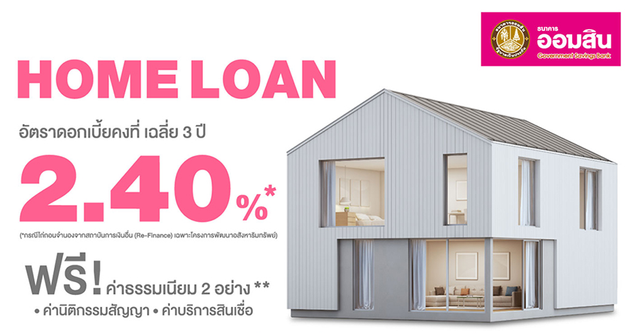 Home Loan ดอกเบี้ยต่ำ เฉลี่ย 3 ปี เพียง 2.40% ต่อปี พร้อมฟรี! ค่าธรรมเนียม 2 อย่าง จากธนาคารออมสิน