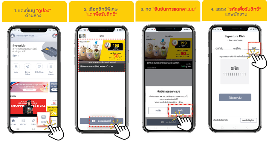 - กรุณากดปุ่ม "แตะเพื่อรับสิทธิ์" เพื่อแลกรับคูปอง โดยใช้รหัส คูปอง ดังกล่าวเป็นส่วนลดในขั้นตอนการชำระเงิน และกดปุ่ม "ร้านค้ากดเพื่อรับสิทธิ์" หลังจากชำระเงินเรียบร้อยแล้วเพื่อยืนยันการใช้สิทธิ์