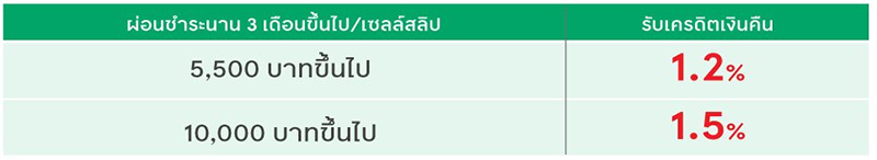 - ยอดผ่อนชำระ 10,000 บาทขึ้นไป/เซลล์สลิปและนาน 3 เดือนขึ้นไป รับเครดิตเงินคืน 1.5%