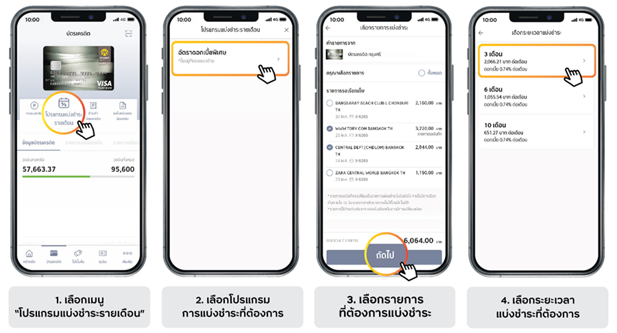 - เปลี่ยนยอดรูดเต็มเป็นแบ่งชำระรายเดือนได้ทันที สำหรับยอดใช้จ่ายขั้นต่ำตั้งแต่ 3,000 บาท/เซลล์สลิปขึ้นไป