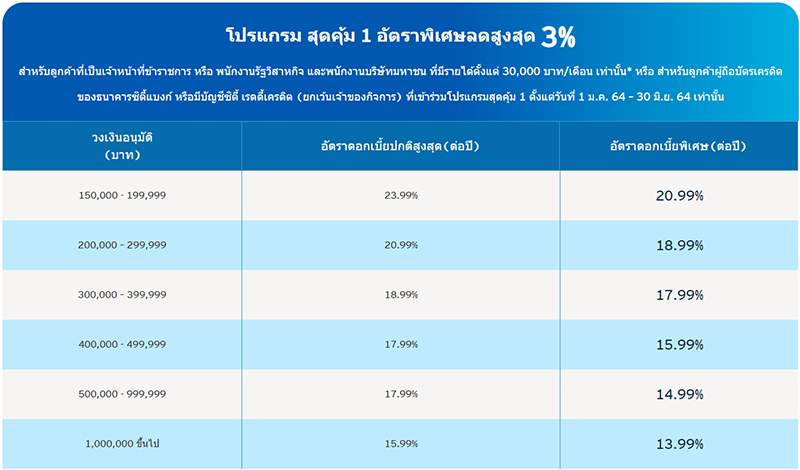 - บริษัทฯ ขอสงวนสิทธิ์ในการใช้หลักเกณฑ์และนโยบายภายในของบริษัทในการอนุมัติวงเงิน หรือปฏิเสธคำขอกู้ รวมถึงกำหนดอัตราดอกเบี้ยพิเศษซึ่งอาจแตกต่างจากตารางข้างต้น