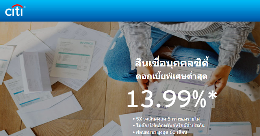 สินเชื่อบุคคลซิตี้ ดอกเบี้ยพิเศษต่ำสุด 13.99% สมัครง่าย ไม่ต้องใช้หลักทรัพย์หรือผู้ค้ำประกัน
