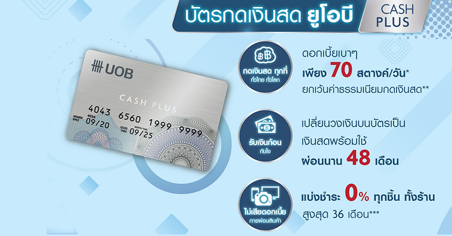 สมัครบัตรกดเงินสด ยูโอบี แคชพลัส วันนี้ ดอกเบี้ยเบาๆ เพียง 70 สตางค์/วัน ยกเว้นค่าธรรมเนียมกดเงินสด และรับเงินก้อนทันใจ เปลี่ยนวงเงินบนบัตรเป็นเงินสดพร้อมใช้ ผ่อนนาน 48 เดือน ไม่เสียดอกเบี้ยการผ่อนสินค้า แบ่งชำระ 0% ทุกชิ้น ทั้งร้าน สูงสุด 36 เดือน