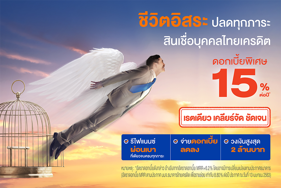 สินเชื่อบุคคล ธนาคารไทยเครดิตเพื่อรายย่อย มอบชีวิตอิสระ สำหรับพนักงานเงินเดือนประจำ รายได้ต่อเดือน 50,000 บาทขึ้นไป ที่ทำงานในกรุงเทพ นนทบุรี ปทุมธานี สมุทรปราการ สมุทรสาคร นครปฐม และชลบุรี