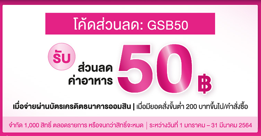 2. ผู้ถือบัตรกรอกรหัสส่วนลด GSB50 ในช่องรหัสส่วนลด และเลือกวิธีการชำระเงินผ่านบัตรเครดิตธนาคารออมสิน ก่อนทำการสั่งซื้อ ชำระค่าอาหาร สำหรับบริการสั่งอาหาร เท่านั้น