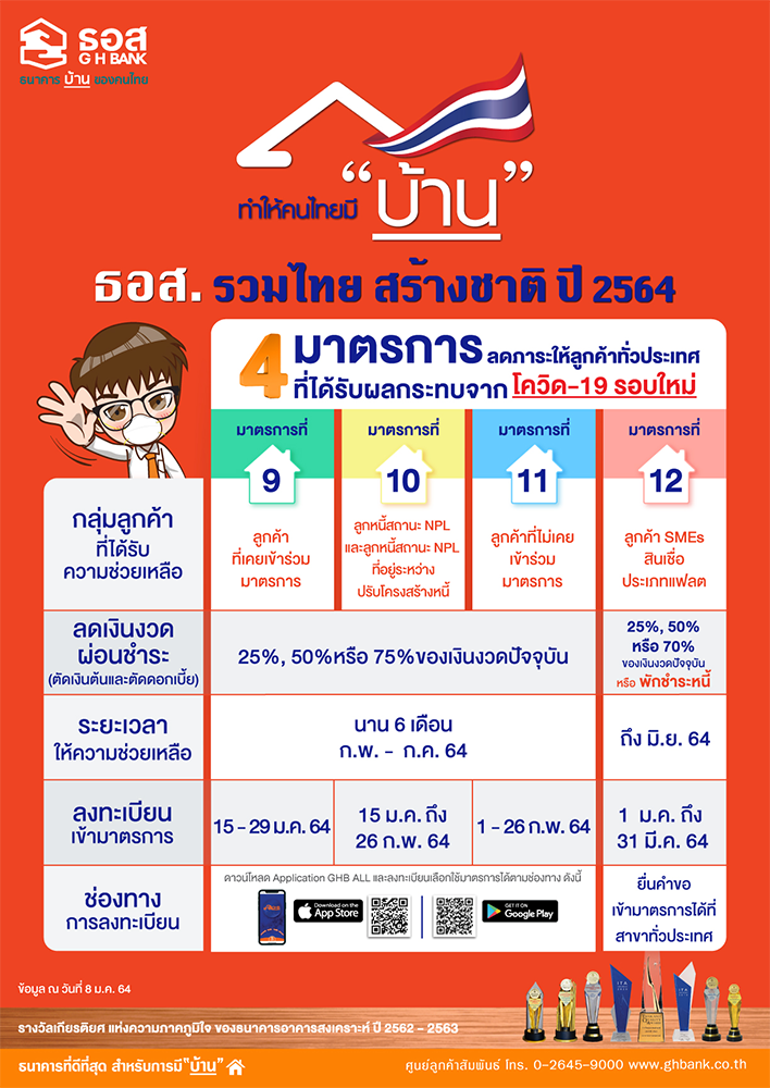 มาตรการที่ 10 สำหรับลูกหนี้สถานะ NPL และลูกหนี้สถานะ NPL ที่อยู่ระหว่างการปรับโครงสร้างหนี้ ลดเงินงวดผ่อนชำระ(ตัดเงินต้นและตัดดอกเบี้ย) เหลือ 25% หรือ 50% หรือ 75% ของเงินงวดผ่อนชำระในปัจจุบันเป็นระยะเวลา 6 เดือน(กุมภาพันธ์-กรกฎาคม 2564) ลงทะเบียนแจ้งความประสงค์เข้าร่วมมาตรการระยะแรก ผ่าน Application : GHB ALL ได้ตั้งแต่วันที่ 15 มกราคม - 26 กุมภาพันธ์ 2564
