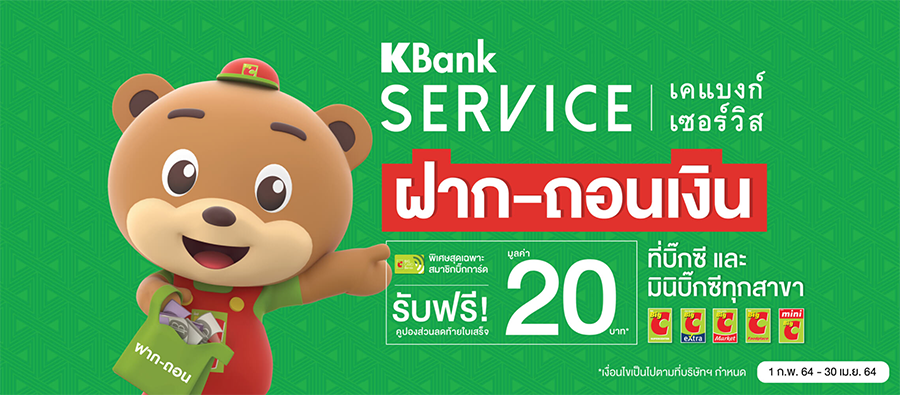 - รับคูปองส่วนลดท้ายใบเสร็จ 20 บาท เมื่อทำธุรกรรม ฝาก ถอนเงิน บัญชีธนาคารกสิกรไทย ที่แคชเชียร์บิ๊กซีทุกสาขา