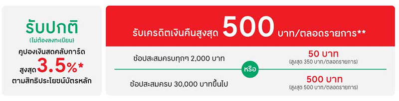 - **เมื่อช้อปสะสมครบ ทุกๆ 2,000 บาท รับเครดิตเงินคืน 50 บาท (จำกัดยอดใช้จ่ายสูงสุด 14,000 บาท หรือ เครดิตเงินคืนสูงสุด 350 บาท/บัญชีบัตรหลัก/ตลอดรายการ) หรือ ช้อปสะสมครบ 30,000 บาทขึ้นไป รับเครดิตเงินคืน 500 บาท (จำกัดยอดใช้จ่ายสูงสุด 30,000 บาท หรือ เครดิตเงินคืนสูงสุด 500 บาท/บัญชีบัตรหลัก/ตลอดรายการ)