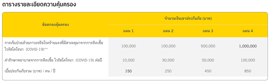 - ข้อยกเว้น : แผนประกันภัยนี้ไม่คุ้มครองการติดเชื้อไวรัสโคโรนา (Coronavirus (2019-nCoV)) ภายในระยะเวลา 14 วัน (Waiting Period) นับจากวันที่กรมธรรม์ประกันภัยมีผลบังคับครั้งแรก