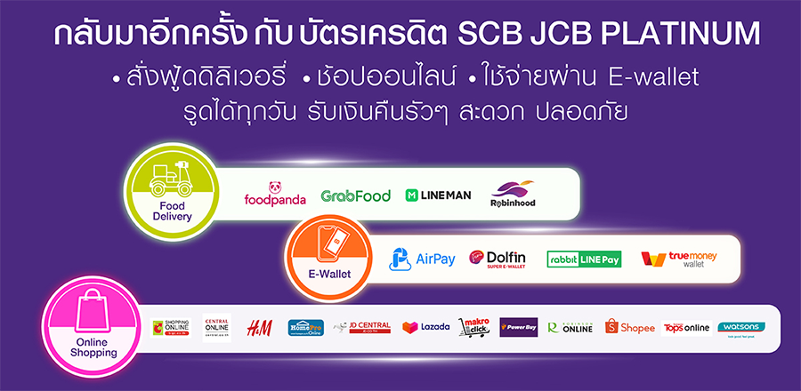 รายละเอียดโปรโมชั่น - สิทธิพิเศษเฉพาะผู้ถือบัตรเครดิตธนาคารไทยพาณิชย์ SCB JCB PLATINUM ("ผู้ถือบัตร") ที่มียอดชำระค่าสินค้า / บริการผ่านบัตรเครดิตธนาคารไทยพาณิชย์ SCB JCB PLATINUM (?บัตรเครดิต?) แบบเต็มจำนวน ณ หมวดร้านค้าออนไลน์ที่ร่วมรายการในประเทศไทย ในระบบของ JCB สำหรับรายการส่งเสริมการขายนี้เท่านั้น ได้แก่ หมวดบริการส่งอาหาร (Food Delivery) อาทิ foodpanda, GrabFood, LINE MAN, Robinhood, หมวดกระเป๋าเงินอิเล็กทรอนิกส์ (E-Wallet) อาทิ AirPay, Dolfin, Rabbit LINE Pay, Truemoney Wallet และหมวดซื้อสินค้าออนไลน์ (Online Shopping) อาทิ Big C Online, Central Online, H&M, Home Pro Online, JD Central, Lazada, Makro Click, Power Buy, Robinson, Shopee, Tops Online, Watson
