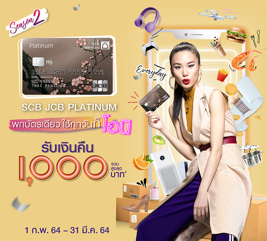 สิทธิพิเศษนี้สำหรับผู้ถือบัตรเครดิต SCB JCB Platinum สะสมยอดช้อปออนไลน์ครบ 8,500 บาทต่อเดือน รับเครดิตเงินคืน 5% สูงสุด 500 บาทต่อเดือน และสูงสุดไม่เกิน 1,000 บาทตลอดรายการ
