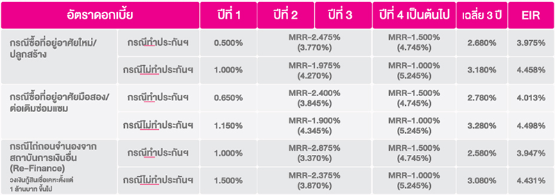 - อัตราดอกเบี้ยที่แท้จริงตลอดอายุสัญญา (EIR) คำนวณจากวงเงินกู้ 1,000,000 บาท ระยะเวลาผ่อนชำระ 20 ปี