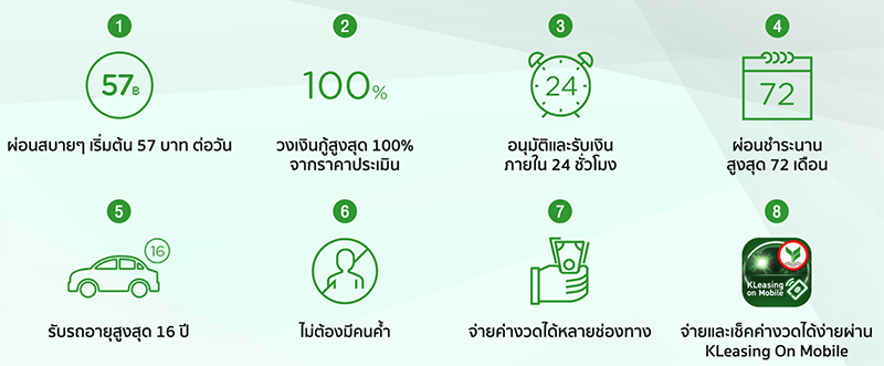 - การพิจารณาเครดิต หลักเกณฑ์และเงื่อนไขอื่นๆ เป็นไปตามที่ บริษัท ลีสซิ่งกสิกรไทย จำกัด กำหนด และบริษัทฯ ขอสงวนสิทธิ์ในการเปลี่ยนแปลงเงื่อนไขตามที่เห็นสมควร โดยมิต้องแจ้งให้ทราบล่วงหน้า