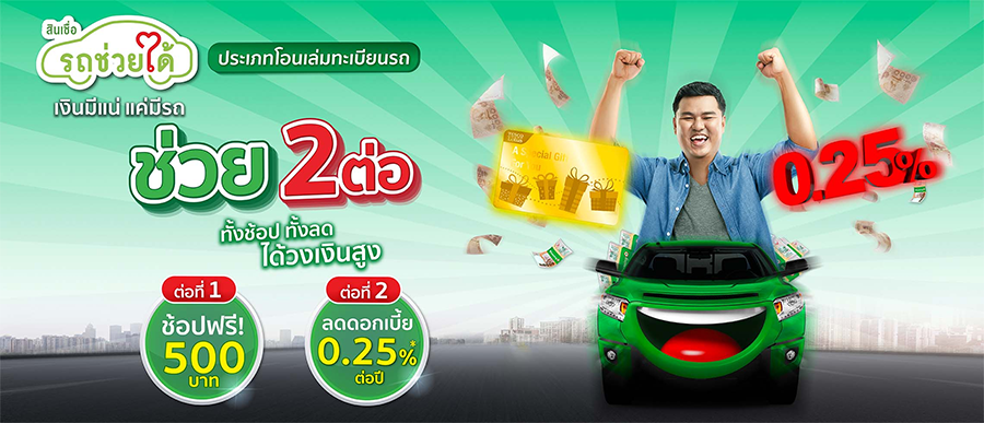 เงื่อนไข - สำหรับลูกค้าที่สมัครสินเชื่อรถช่วยได้ ประเภทโอนเล่มทะเบียนรถสำหรับรถยนต์ ที่เลือกผ่อนชำระทั้งอัตราดอกเบี้ยแบบคงที่และอัตราดอกเบี้ยแบบลดต้นลดดอก ระหว่างวันที่ 1 ก.พ. - 31 มี.ค. 2564 ที่ได้รับการอนุมัติ เกิดสัญญาและเบิกใช้วงเงิน ภายในวันที่ 31 พ.ค. 2564 รับฟรี บัตรกำนัลเทสโก้ โลตัส มูลค่า 500 บาท (จำกัด 1 สิทธิ์ ต่อ 1 สัญญา) โดยจะจัดส่งบัตรกำนัลเทสโก้ โลตัสให้กับลูกค้าภายใน 45 วัน หลังเกิดเป็นสัญญาและเบิกใช้วงเงินแล้ว