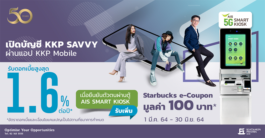 พิเศษ! สำหรับลูกค้าที่เปิดบัญชีเงินฝากออมทรัพย์ออนไลน์ KKP Savvy ผ่านแอป KKP Mobile Application และทำการยืนยันตัวตนผ่านตู้ AIS Smart Kiosk รับเพิ่ม Starbucks e- Coupon มูลค่า 100 บาท*