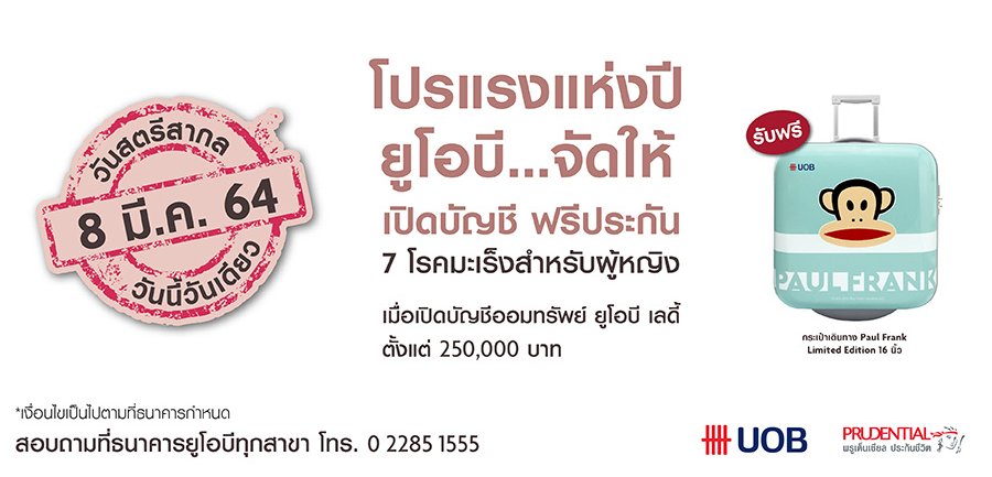 เปิดบัญชีออมทรัพย์ ยูโอบี เลดี้ ตั้งแต่ 250,000 บาทเป็นต้นไป รับ Paul Frank Trolley Bag 16 นิ้ว*