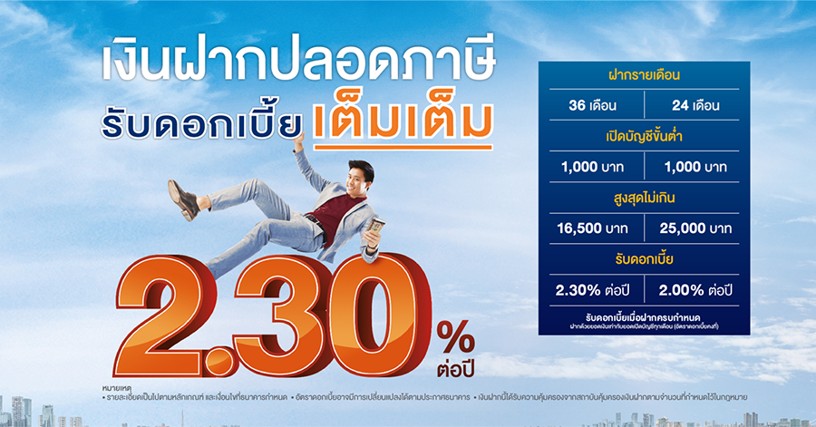 อัตราดอกเบี้ยเงินฝากปลอดภาษี 36 เดือน : 2.30% ต่อปี