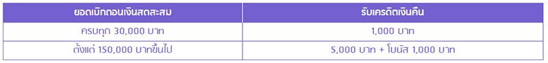 - ยอดเบิกถอนเงินสดสะสมครบทุก 30,000 บาท รับเครดิตเงินคืน 1,000 บาท