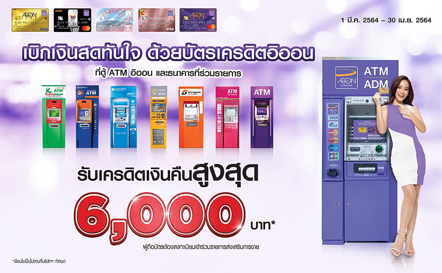 (3) www.aeon.co.th (ไม่มีค่าบริการ) ภายในระยะเวลารายการส่งเสริมการขาย และได้รับข้อความตอบรับจากระบบ (1 ครั้ง / บัญชีบัตรหลัก / รายการส่งเสริมการขาย) โปรดเก็บหลักฐานการทำรายการไว้เพื่อการตรวจสอบ - ผู้ถือบัตรจะต้องมียอดเงินต้นจากการเบิกถอนเงินสดคงค้างในบัญชีบัตรไม่ต่ำกว่า 10,000 บาท จนถึงวันที่ 10 มิ.ย.2564
