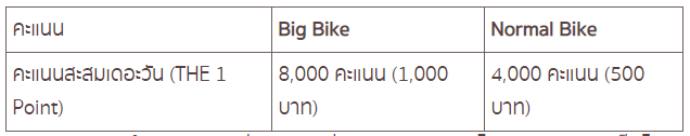- คะแนนสะสมเดอะวัน 8,000 คะแนน (1,000 บาท) สำหรับรถจักรยานยนต์บิ๊ก ไบค์