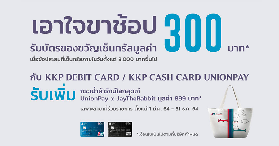 รับบัตรของขวัญเซ็นทรัลมูลค่า 300 บาท เมื่อช้อปสะสมภายในวัน ตั้งแต่ 3,000 บาทขึ้นไป ที่เซ็นทรัลทุกสาขา รับเพิ่ม! กระเป๋าผ้ารักษ์โลกสุดเก๋ UnionPay x JayTheRabbit มูลค่า 899 บาท เฉพาะสาขาที่ร่วมรายการ ระยะเวลา 1 มี.ค.64 - 31 ธ.ค. 64
