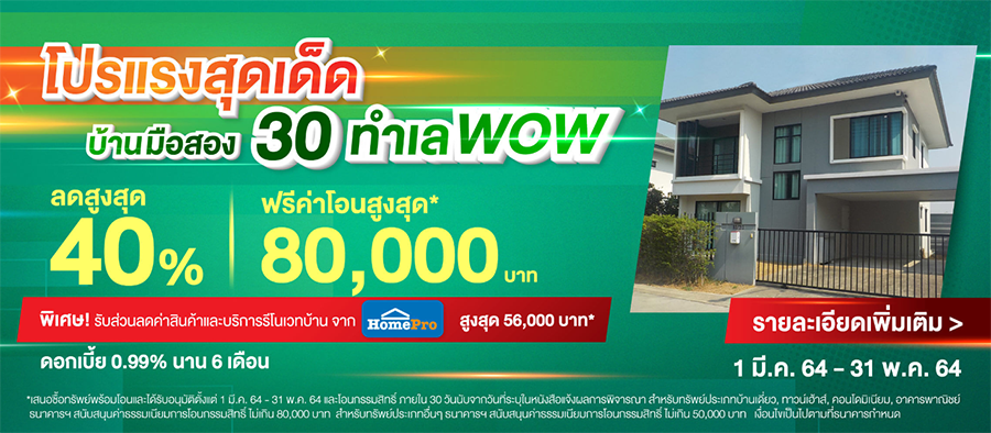 โปรแรงสุดเด็ด ลดสูงสุด 40% ฟรี!! ค่าโอน...บ้านมือสอง 30 ทำเล WOW พิเศษ! รับส่วนลดค่าสินค้า และบริการรีโนเวทบ้าน จาก HomePro สูงสุด 56,000 บาท
