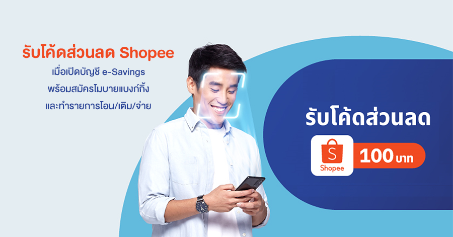 เปิดบัญชี e-Savings พร้อมสมัครโมบายแบงก์กิ้ง รับโค้ดส่วนลด Shopee มูลค่า 100 บาท*