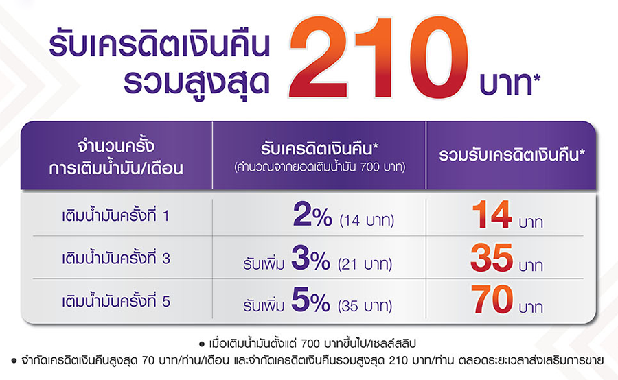 - เติมน้ำมันครั้งที่ 3: ยอดรวมนับจากครั้งที่ 1 ตั้งแต่ 2,100 บาทขึ้นไป รับเครดิตเงินคืนเพิ่ม 3% (สูงสุด 21 บาท) รวมรับเครดิตเงินคืน 35 บาท,
