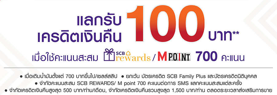 - เมื่อเติมน้ำมันตั้งแต่ 700 บาทขึ้นไป/เซลล์สลิป และ ใช้คะแนนสะสม SCB REWARDS/ M point 700 คะแนน แลกรับเครดิตเงินคืน 100 บาท