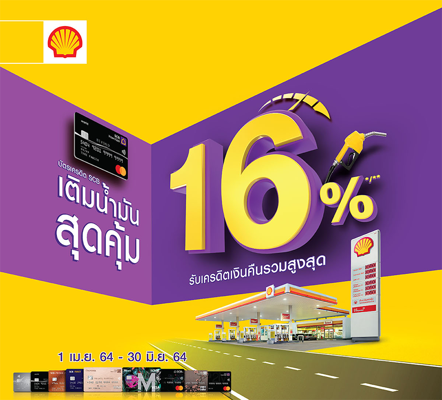 เติมน้ำมันสุดคุ้มที่ปั๊ม Shell กับบัตรเครดิต SCB รับเครดิตเงินคืนรวมสูงสุด 16%*/**