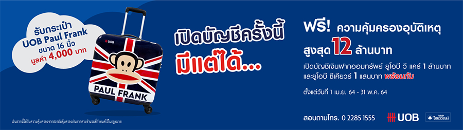 บัญชีเงินฝากออมทรัพย์ยูโอบี วีแคร์ (UOB Vcare) 1 ล้านบาท และ บัญชีเงินฝากออมทรัพย์ยูโอบี ซีเคียวร์ 1 แสนบาทพร้อมกัน รับกระเป๋า UOB Paul Frank ขนาด 16 นิ้ว มูลค่า 4,000 บาท