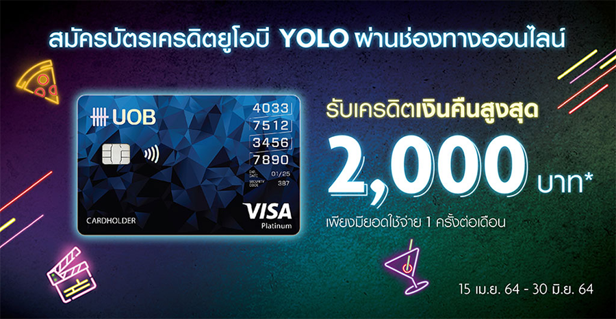 สำหรับลูกค้าใหม่ที่สมัครบัตรเครดิตยูโอบี โยโล่ แพลทินัม ผ่านช่องทางออนไลน์ และได้รับการอนุมัติบัตรเครดิตจากธนาคารภายในวันที่ 16 ก.ค. 64 เท่านั้น รับเครดิตเงินคืนเข้าบัญชีบัตรเครดิตเดือนละ 500 บาท เมื่อมียอดใช้จ่ายผ่านบัตรเครดิตโยโล่ แพลทินัม อย่างน้อย 1 ครั้ง ภายใน 1 เดือน ได้นานสูงสุด 4 เดือน (สูงสุด 2,000 บาท)