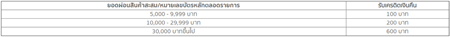 - สงวนสิทธิ์เครดิตเงินคืนสูงสุด 600 บาทต่อ 1 หมายเลขบัตรหลักตลอดรายการ