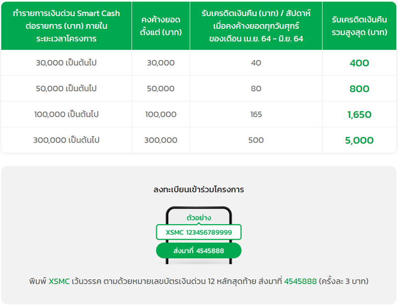 - วิธีเข้าร่วมโครงการ ลูกค้าต้องลงทะเบียนผ่าน SMS ทางโทรศัพท์เคลื่อนที่ โดยส่ง SMS มาลงทะเบียนกับธนาคาร 1 ท่าน ต่อ 1 หมายเลขบัตร โดยพิมพ์ XSMC เว้นวรรค ตามด้วยหมายเลขบัตรเงินด่วน 12 หลักสุดท้าย ส่งมาที่ 4545888 (ครั้งละ 3 บาท) และได้รับข้อความยืนยันการเข้าร่วมโครงการจากธนาคารภายในระยะเวลาโครงการเท่านั้น