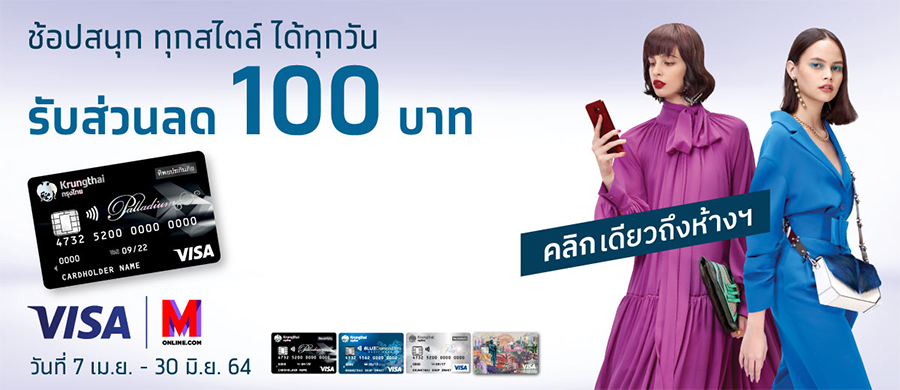 สิทธิพิเศษ ลูกค้่าบัตรเดบิตกรุงไทย วีซ่า และ Krungthai Travel Card เมื่อผูกบัตรฯ และช้อปครั้งแรกที่ www.monline.com ตั้งแต่ 1,000 บาทขึ้นไป รับส่วนลด 100 บาท