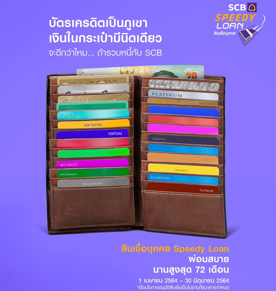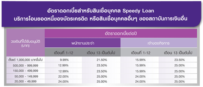 เงื่อนไขการบริการโอนยอดหนี้ของบัตรเครดิต หรือสินเชื่อบุคคลของสถาบันการเงินอื่นอัตราดอกเบี้ยสำหรับสินเชื่อบุคคล Speedy Loan เฉพาะลูกค้าที่ได้รับการอนุมัติวงเงินสินเชื่อบุคคล Speedy Loan และสมัครใช้บริการโอนยอดหนี้ของเครดิตหรือสินเชื่อบุคคล ของสถาบันการเงินอื่น ระยะเวลาแคมเปญระหว่างวันที่ 1 เมษายน 2564 - 30 มิถุนายน 2564